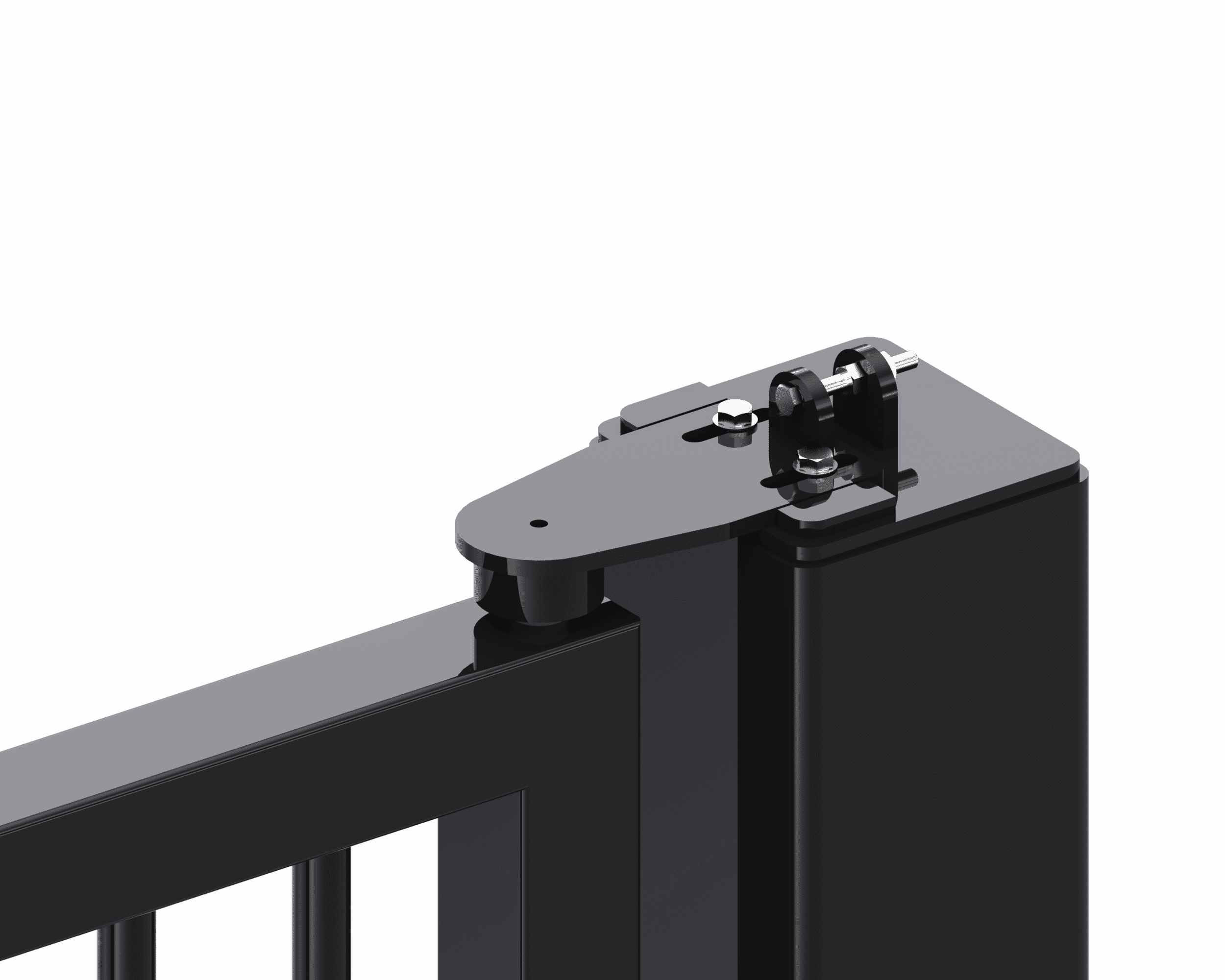 High load bearing equipped hinges are fitted which rotate on the pivot point to minimise closing up of the gate leaf to the post, and so enhancing security.